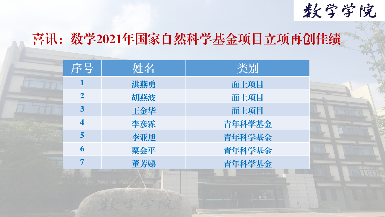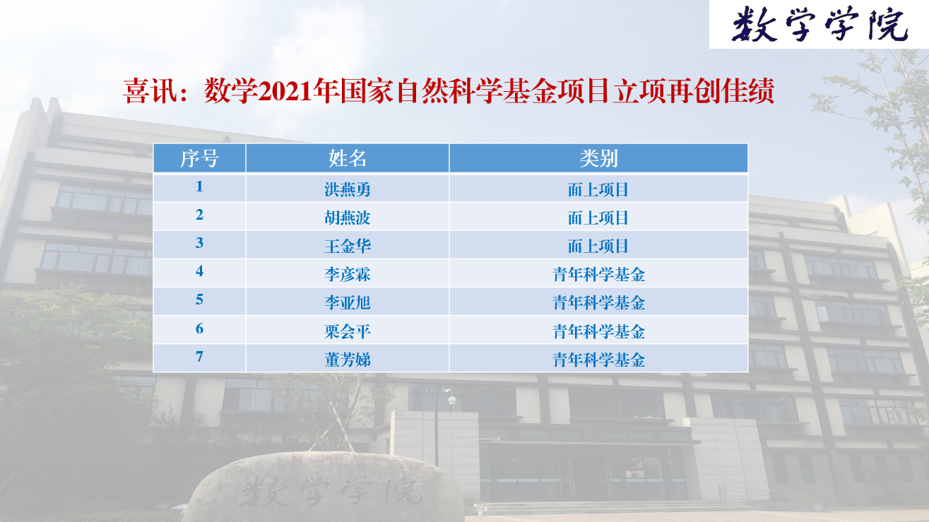 日前,国家自然科学基金委员会(NSFC)公布了2021年国家自然科学基金评审结果。黑料吃瓜网 今年国家自然科学基金项目申报取得佳绩,共有7个项目获立项资助,其中面上项目3项,青年科学基金项目4项。