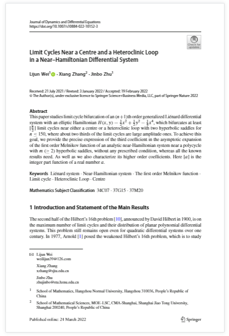 近日,我院数学与应用数学(师范)183班朱锦波同学在指导教师卫丽君老师的指导下,并与上海交通大学张祥教授合作在常微分方程与动力系统方向高水平国际期刊Journal of Dynamics and Differential Equations(JCR:Q1)上发表题为“Limit Cycles Near a Centre and a Heteroclinic Loop in a Near–Hamiltonian Differential System”的学术论文。