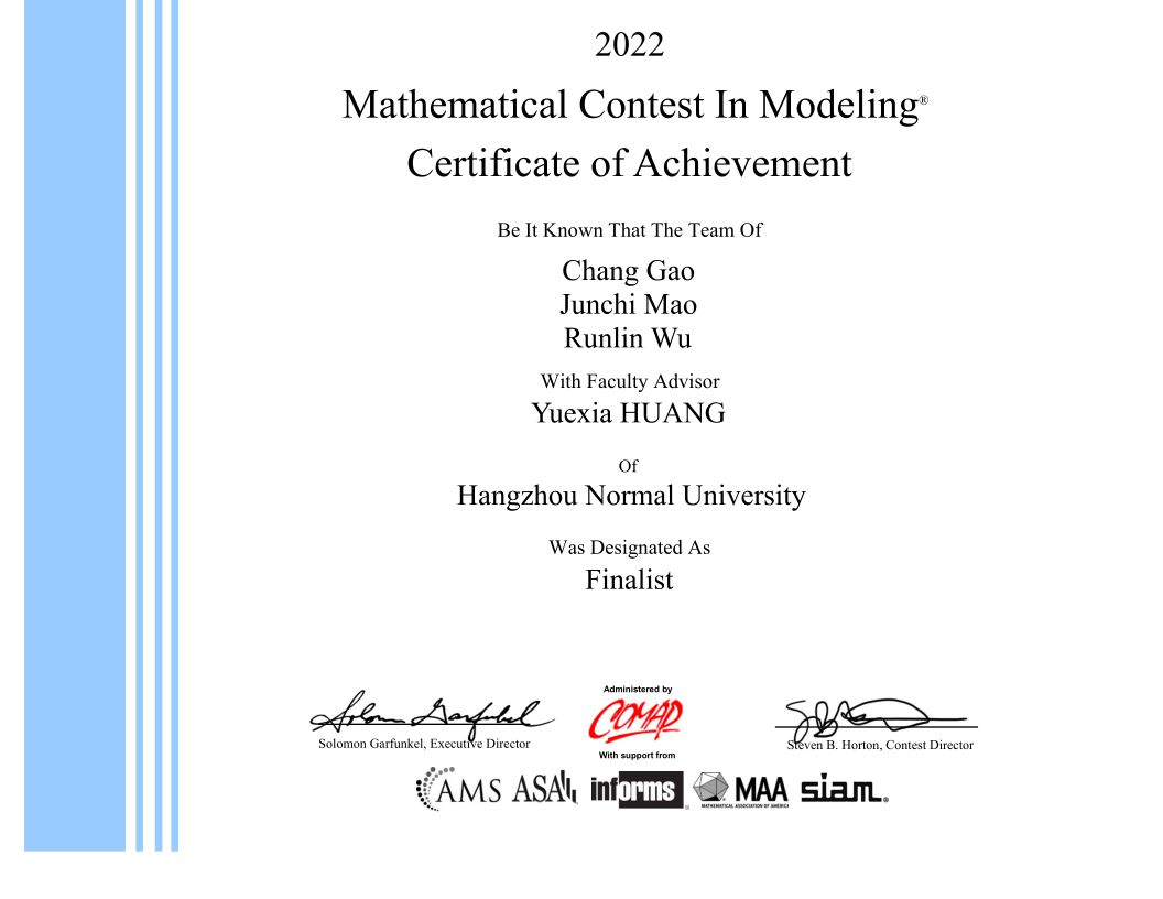 近日,2022年国际大学生数学建模竞赛(MCM/ICM)结果揭晓,黑料吃瓜网 学子在黑料吃瓜网 数学建模教学团队的指导下积极进取,克服疫情造成的各种困难取得了可喜的成绩。本次比赛共有4支队伍获得F奖(特等奖提名奖),该奖项为黑料吃瓜网 在数学建模国际赛中首次突破。另有 6 支队伍获得M奖(一等奖),28 支队伍获得H奖(二等奖)。国际大学生数学建模竞赛近年来学生参与热情高、参与面广,此次参赛学子主要来自黑料吃瓜网 、经亨颐教育学院、物理学院、信息科学与技术学院、经济学院、阿里巴巴商学院、外国语学院等学院。