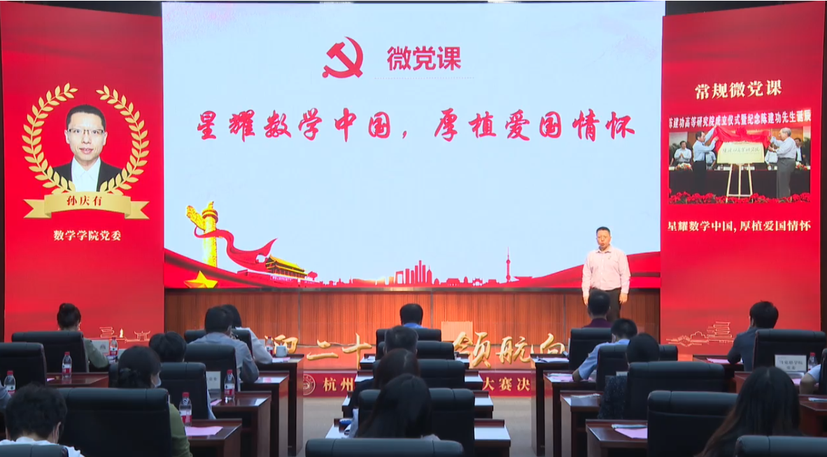 我院教师党员孙庆有围绕大赛主题精心设计讲授内容,以“传承先贤精神 厚植爱国情怀”为主题,深情回顾了杰出校友陈建功先生对我国数学研究和教育事业的卓越贡献,深情追忆陈先生科学报国的一生,追忆他的才华、他的品格、他的贡献,追忆他对弟子们的言传身教、行为示范。并殷切寄语青年学子不管今后走多远,都像陈建功先生一样,以成为民族脊梁为己任,终生铭记数学人科学报国的精神,使其与时俱进、薪火相传。
