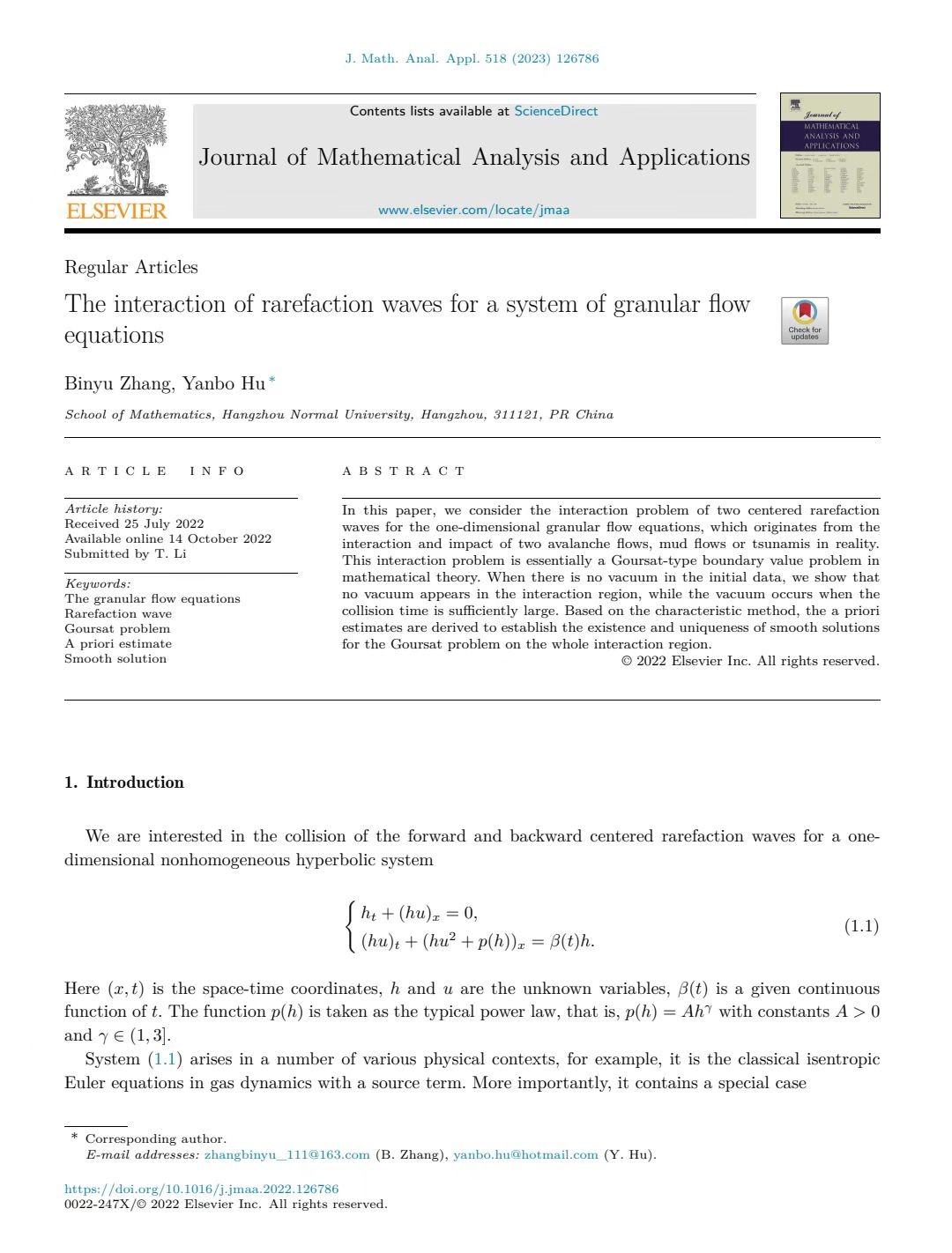 近日,我院数学与应用数学(师范)202班张缤予同学在胡燕波教授指导下以第一作者在国际知名期刊《Journal of Mathematical Analysis and Applications》(JCR:Q1)上发表题为 《The interaction of rarefaction waves for a system of granular flow equations》的学术论文。