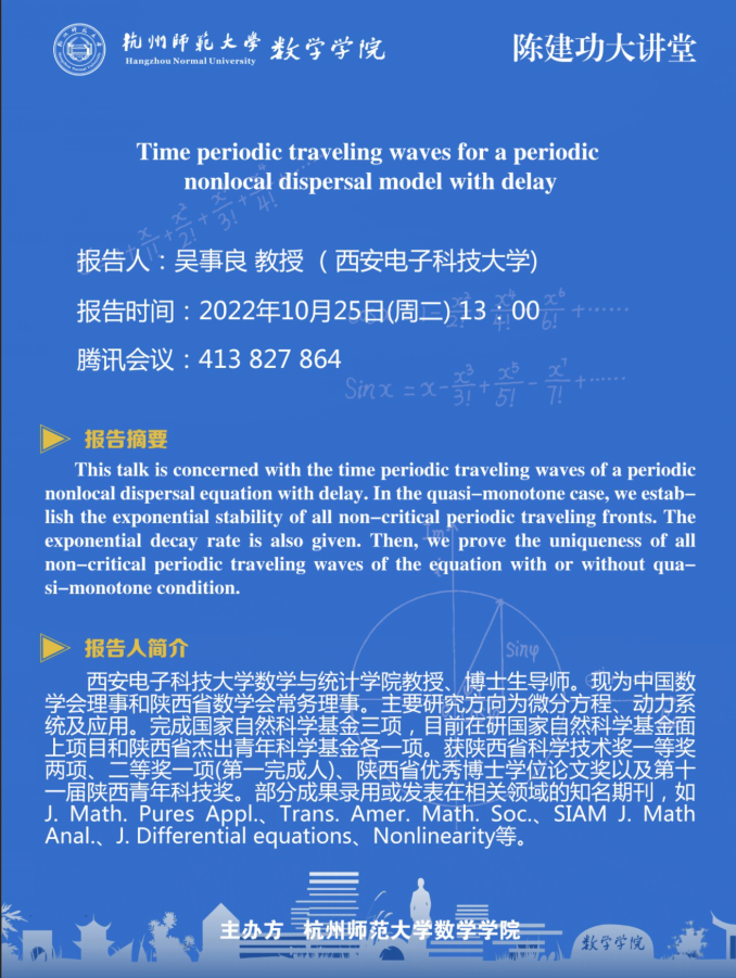 陈建功大讲堂:Time periodic traveling waves for a periodic nonlocal dispersal model with delay