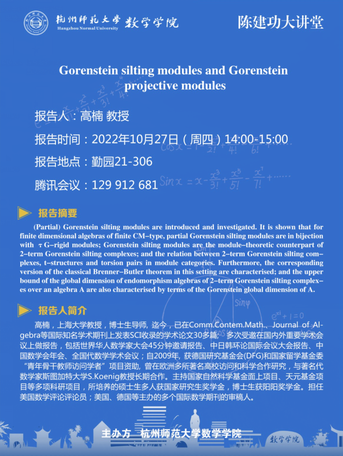 陈建功大讲堂:Gorenstein silting modules and Gorenstein projective modules