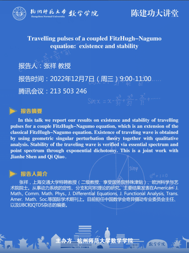 陈建功大讲堂:Travelling pulses of a coupled FitzHugh-Nagumo equation: existence and stability