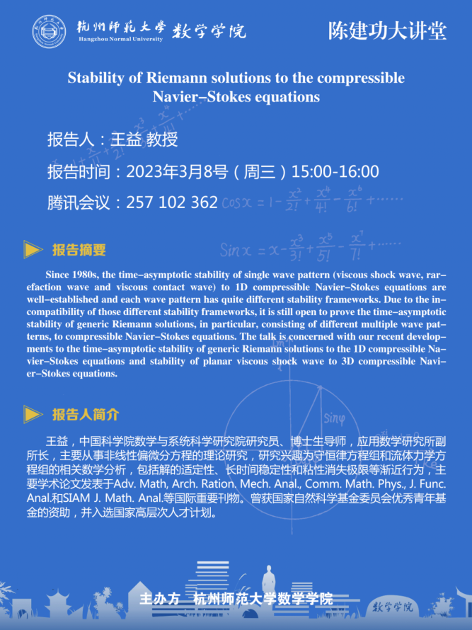 陈建功大讲堂:Stability of Riemann solutions to the compressible Navier-Stokes equations
