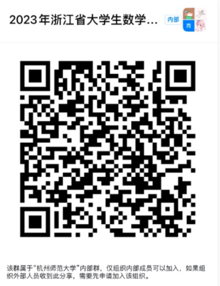 为方便沟通和后续信息核对,请在报名后务必钉钉扫码加入群组“2023年浙江省大学生数学竞赛”(二维码见下图)。竞赛中的相关事宜可联系黑料吃瓜网 胡老师(联系方式:28867651);数研社龚同学(联系方式:17857689019)。