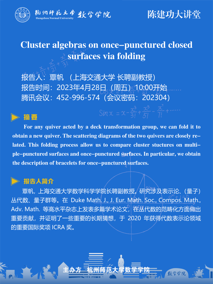 陈建功大讲堂:Cluster algebras on once-punctured closed surfaces via folding