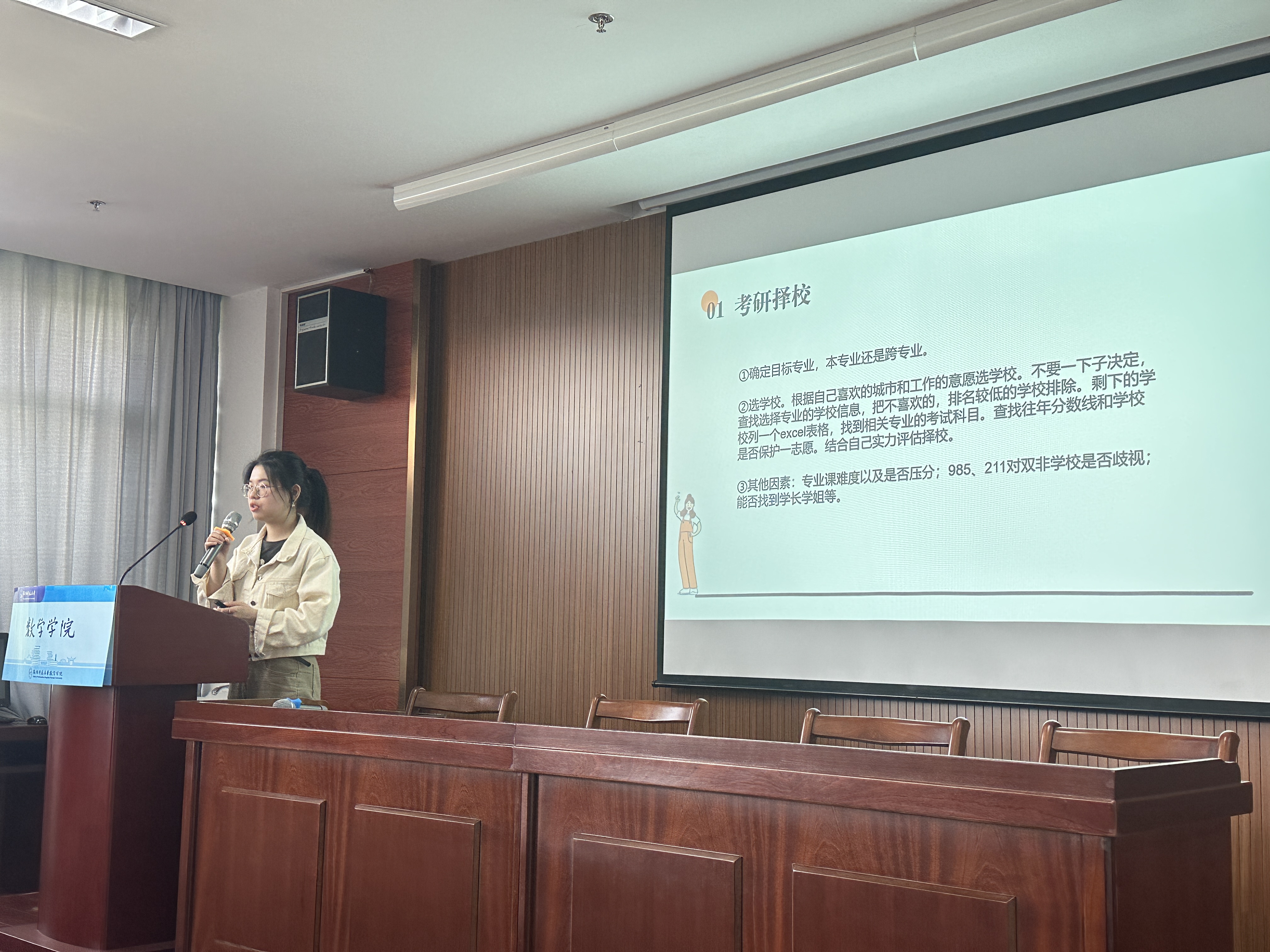 会上,祝斌雁等五位同学分别从自身考研经历出发,围绕专业和院校选择、复习计划制定、书籍推荐、学习技巧等方面畅谈个人亲身体验和感受,并对考研初试以及复试中需要注意的重点事项做了详细介绍,多角度解答了在场同学对于备考中遇到的困难和疑惑,帮助同学们建立信心,缓解考试压力。除了专业知识的储备,他们认为,在考研过程中,坚持与心态十分重要,要清晰认识自己考研的目的,对自己充满信心,坚持到底。