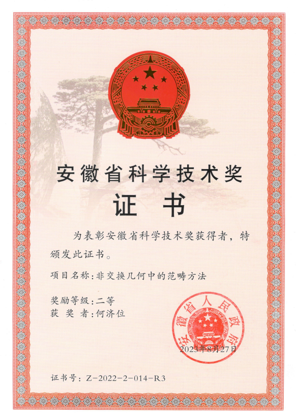 近日,安徽省科学技术厅公布了2022年度安徽省科学技术奖专业(学科)评审结果。我院何济位教授参与的项目“非交换几何中的范畴方法”获二等奖。本项目隶属代数学领域,主要研究非交换几何领域若干重要代数类的环论性质、同调性质和表示理论,如Poisson代数、Hopf代数作用的不变子代数、PI代数等,是代数学、代数几何、数学物理等领域共同关注的重要研究领域。
