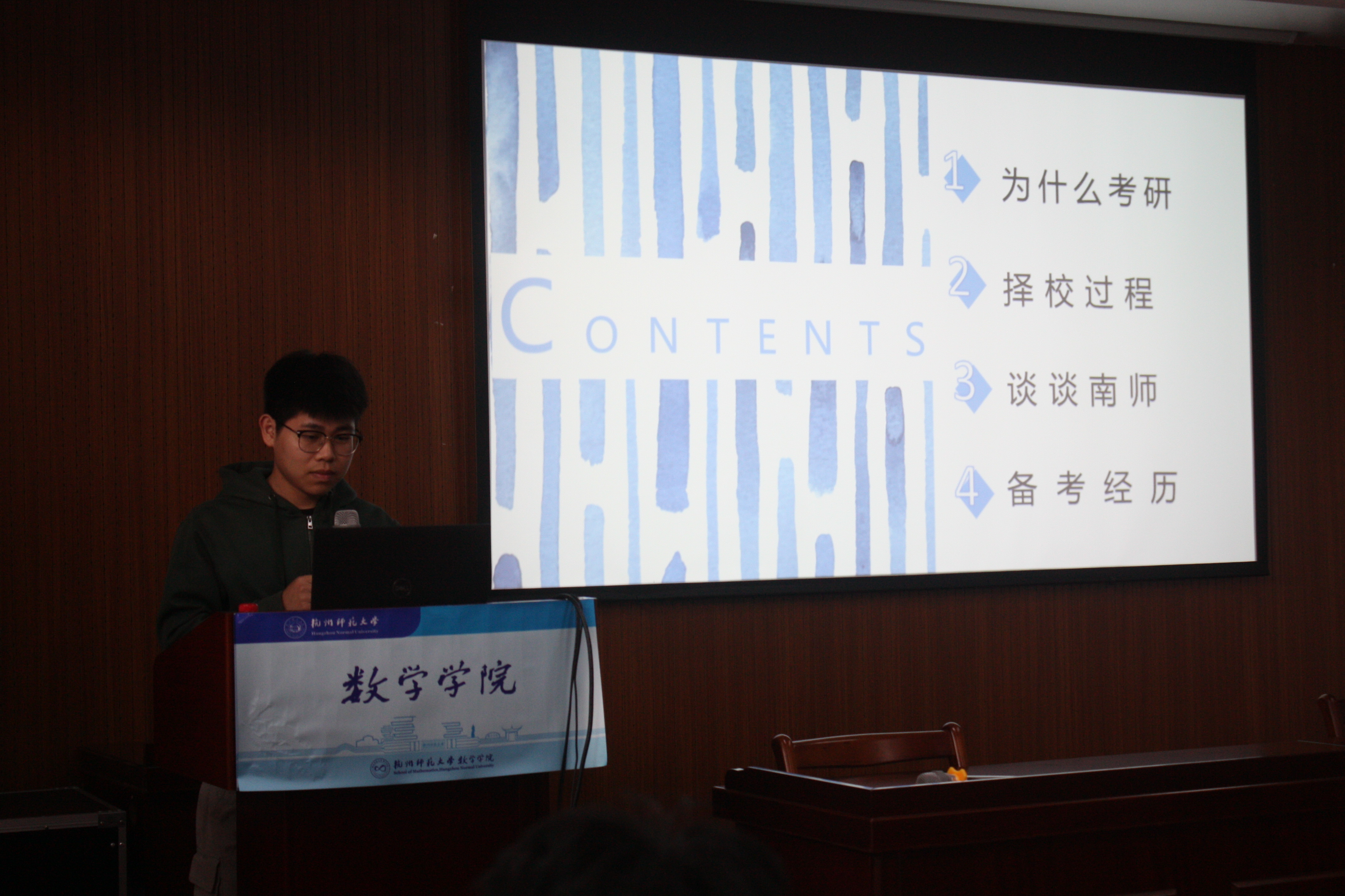 而后由上岸南京师范大学的周德益为同学们分享,他主要从“为什么考研”“择校过程”“谈谈南师”“备考经历”这四个角度展开。对于择校方面,他告诉同学们要参考数学学科评级的排名,挑选出自己感兴趣的学校,查询这些学校往年的招生人数、报录比等等,参考这些信息,列出二次名单,并且对其进行划分。此外他还分不同的时间阶段讲述政治英语专业课的不同安排,特别强调了数分高代的学习和重要性。