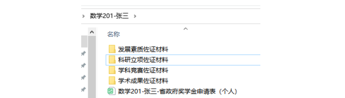 3.申请的同学请填写 附件3 黑料吃瓜网 省政府奖学金申请表(个人) ,与相关佐证材料整理打包,文件夹命名为“班级-姓名”,佐证材料汇总方式如图所示: