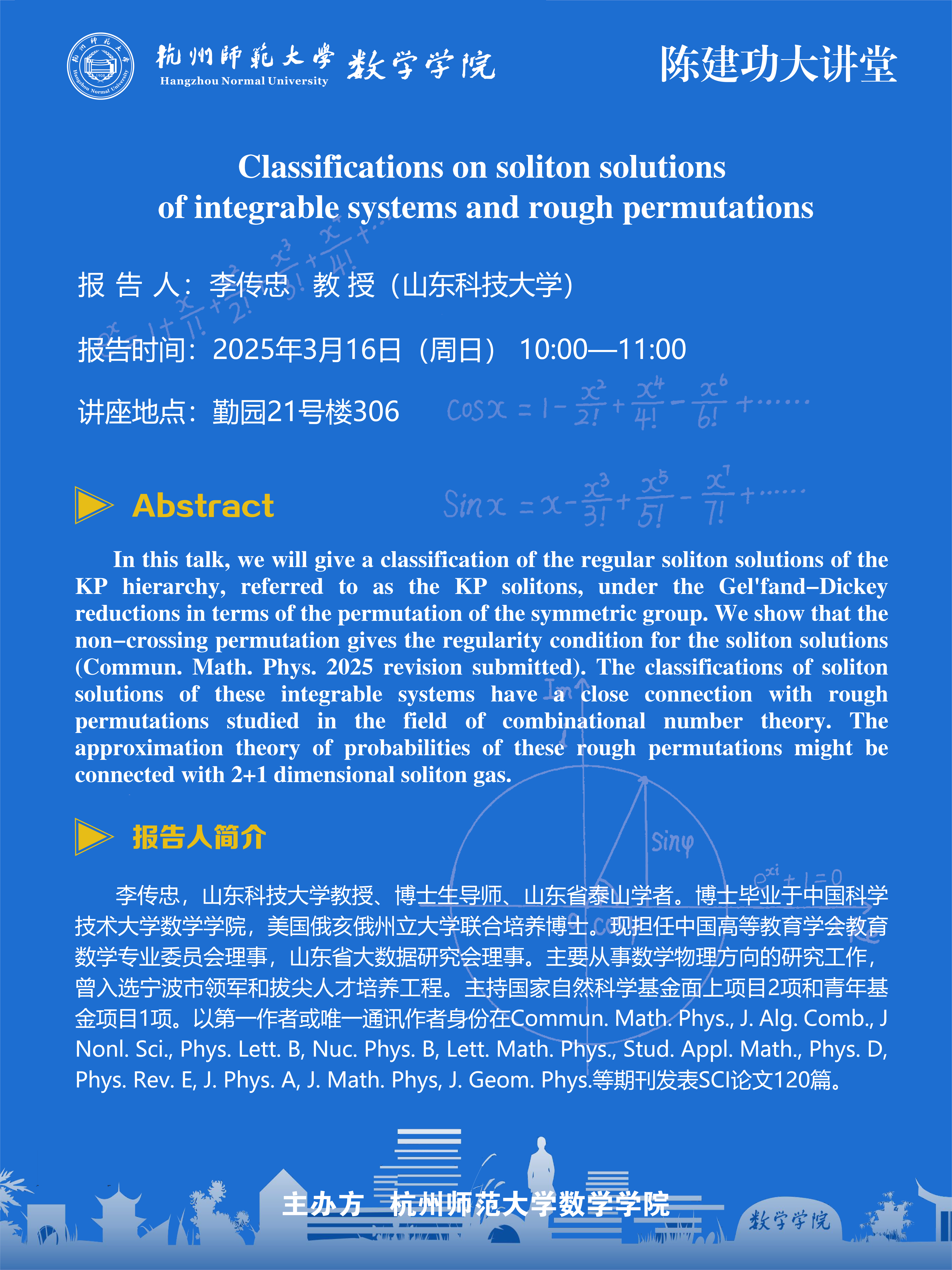 陈建功大讲堂(2025-16):Classifications on soliton solutions of integrable systems and rough permutations