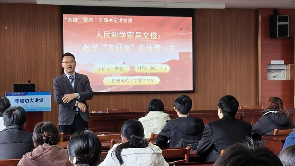 专题党课在缅怀仪式后拉开帷幕。“师大青博”、数据与计算科学系主任、数据与计算科学党支部书记曹健教授为入党积极分子讲述数学“老顽童”吴文俊的传奇一生。