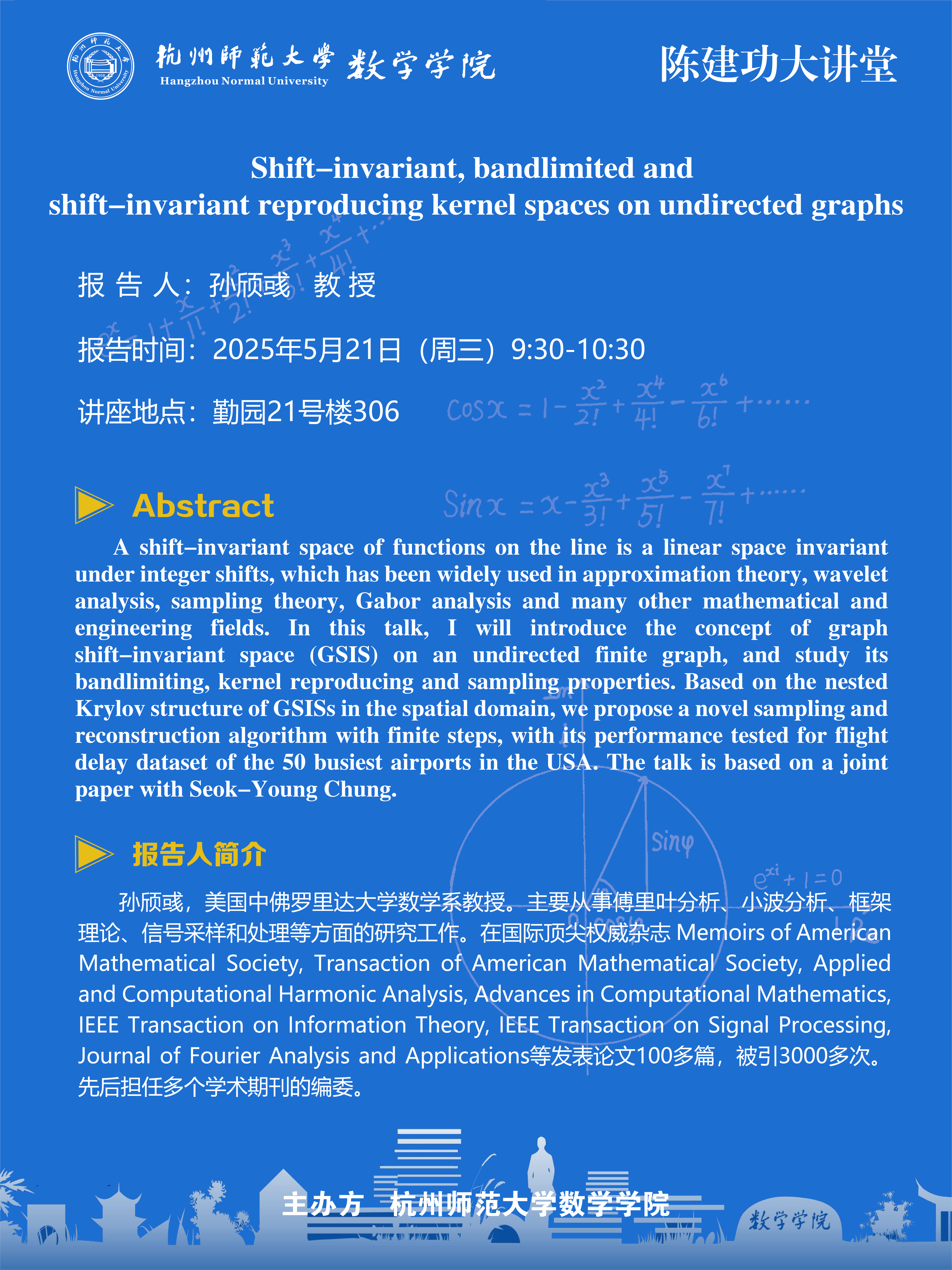 陈建功大讲堂(2025-38):Shift-invariant, bandlimited and shift-invariant reproducing kernel spaces on undirected graphs