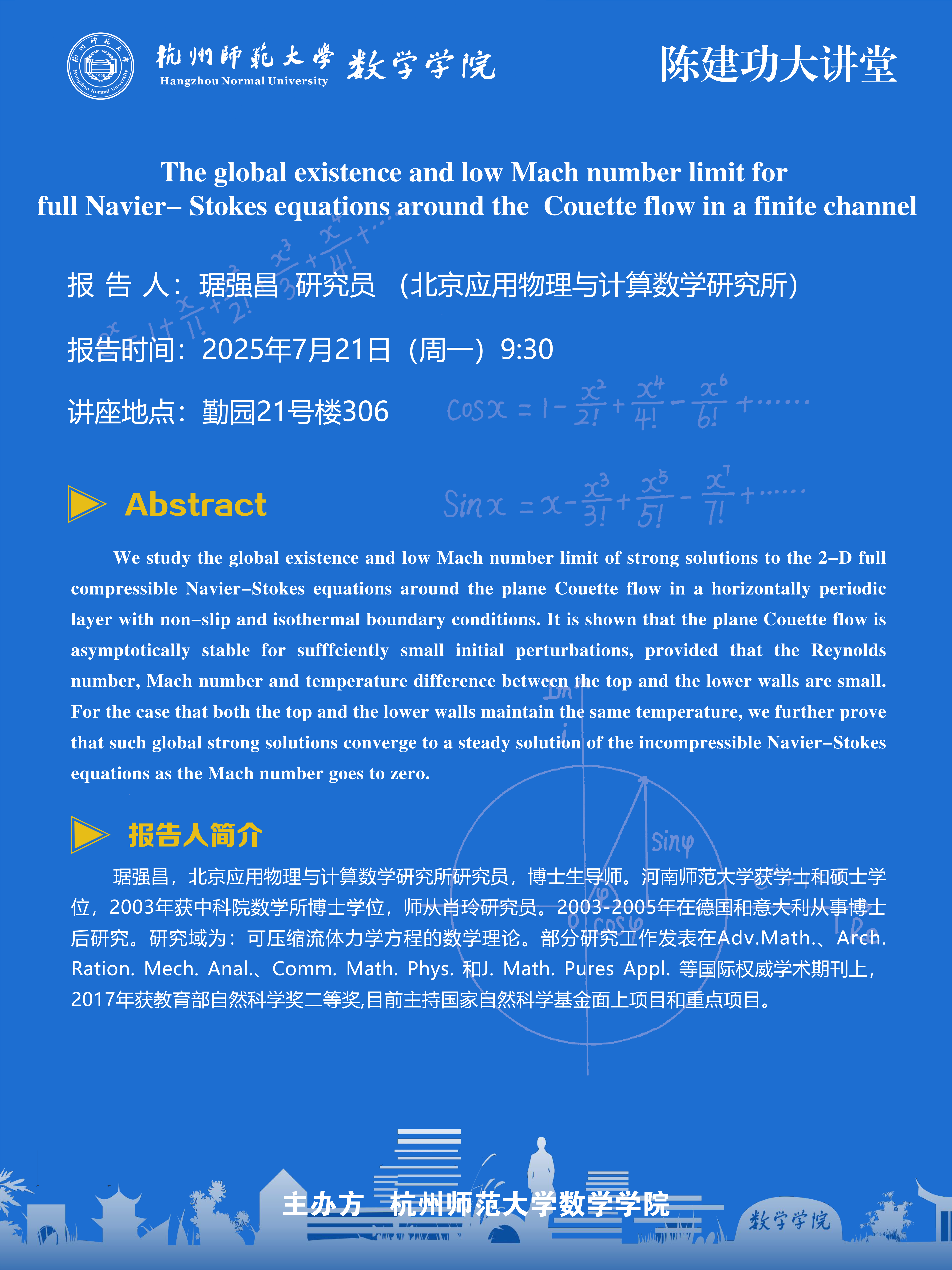 陈建功大讲堂(2025-57):The global existence and low Mach number limit for full Navier-Stokes equations around the Couette flow in a finite channel