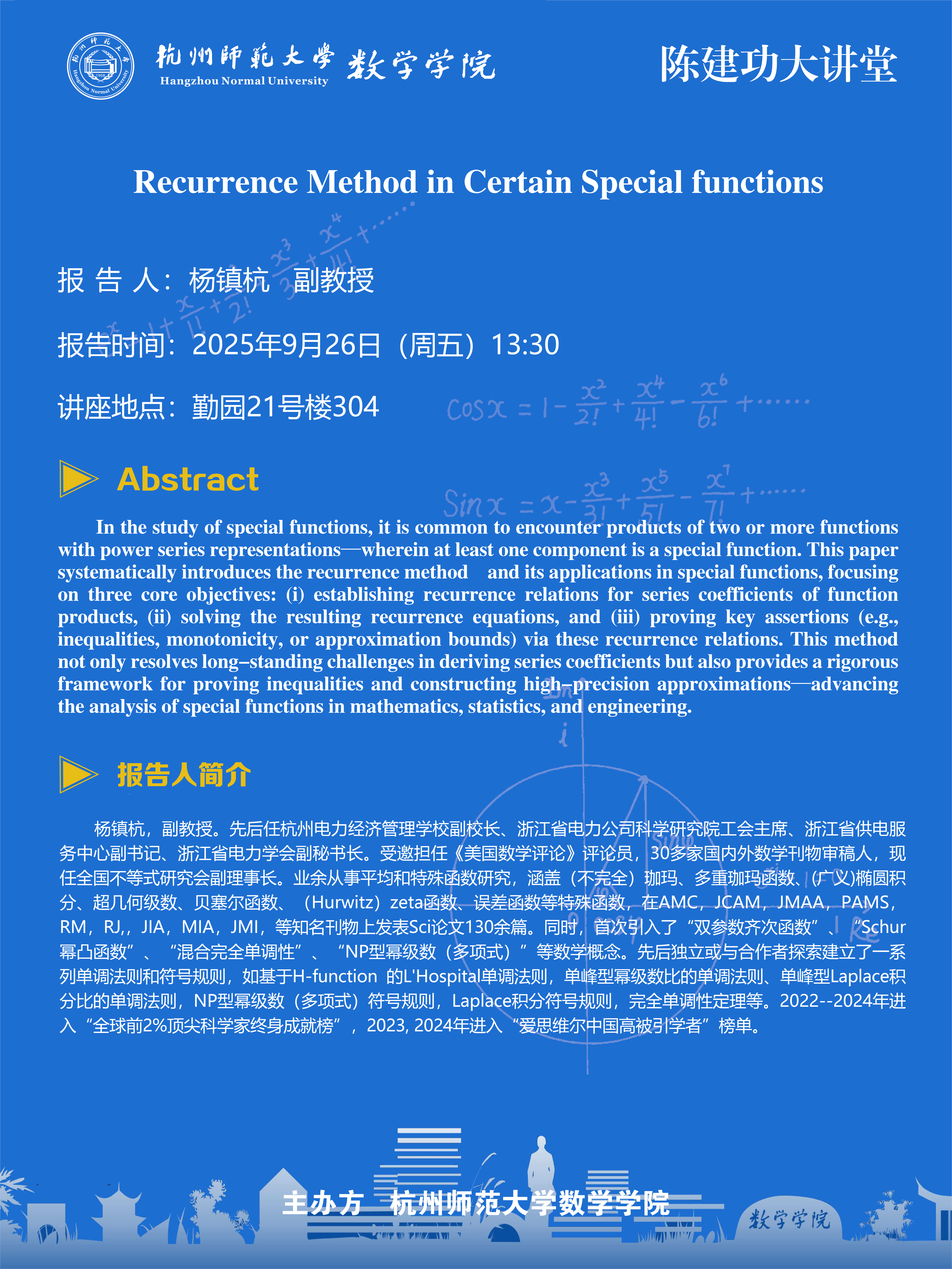 陈建功大讲堂(2025-82):Recurrence Method in Certain Special functions