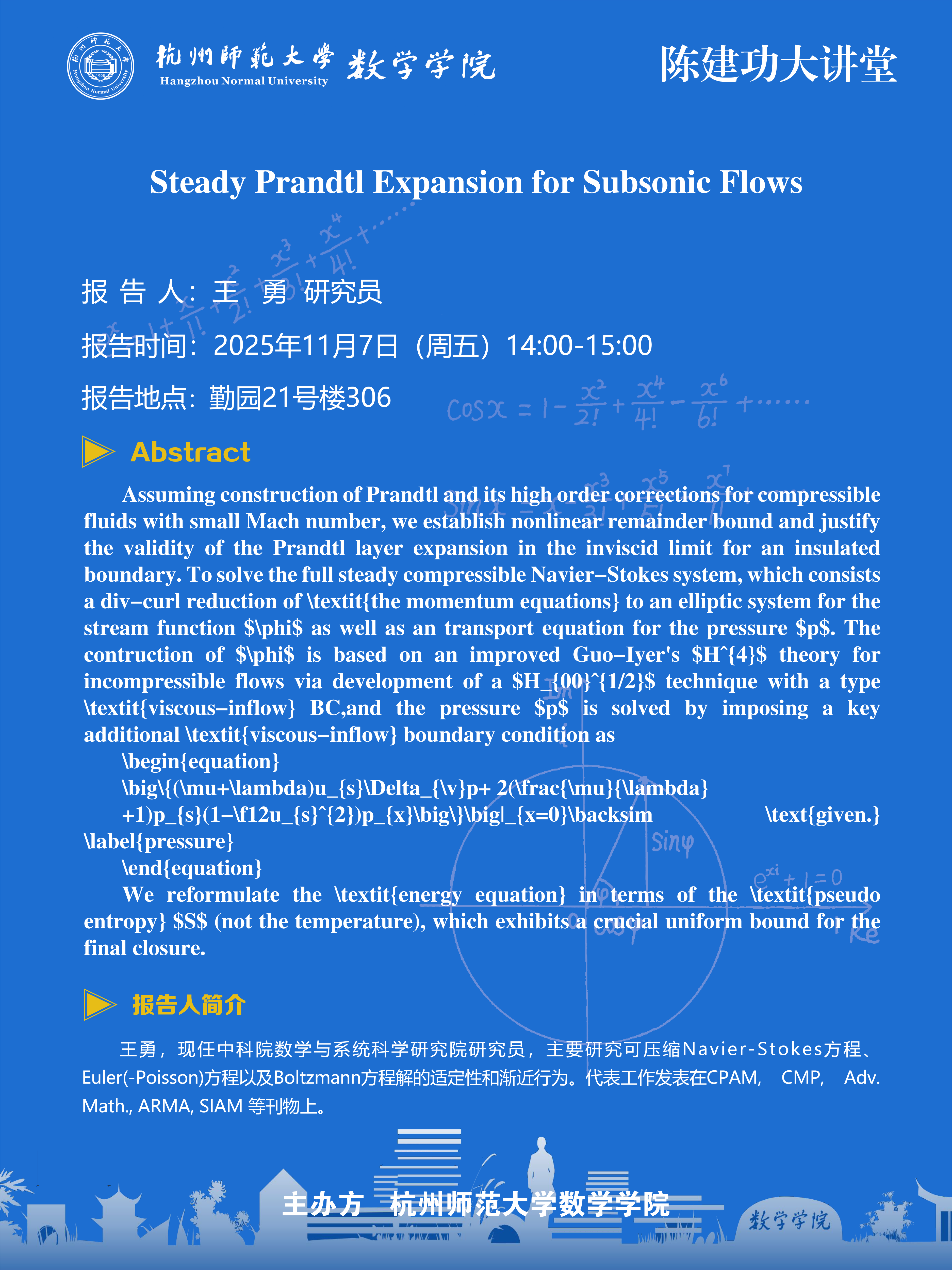 陈建功大讲堂(2025-118):Steady Prandtl Expansion for Subsonic Flows