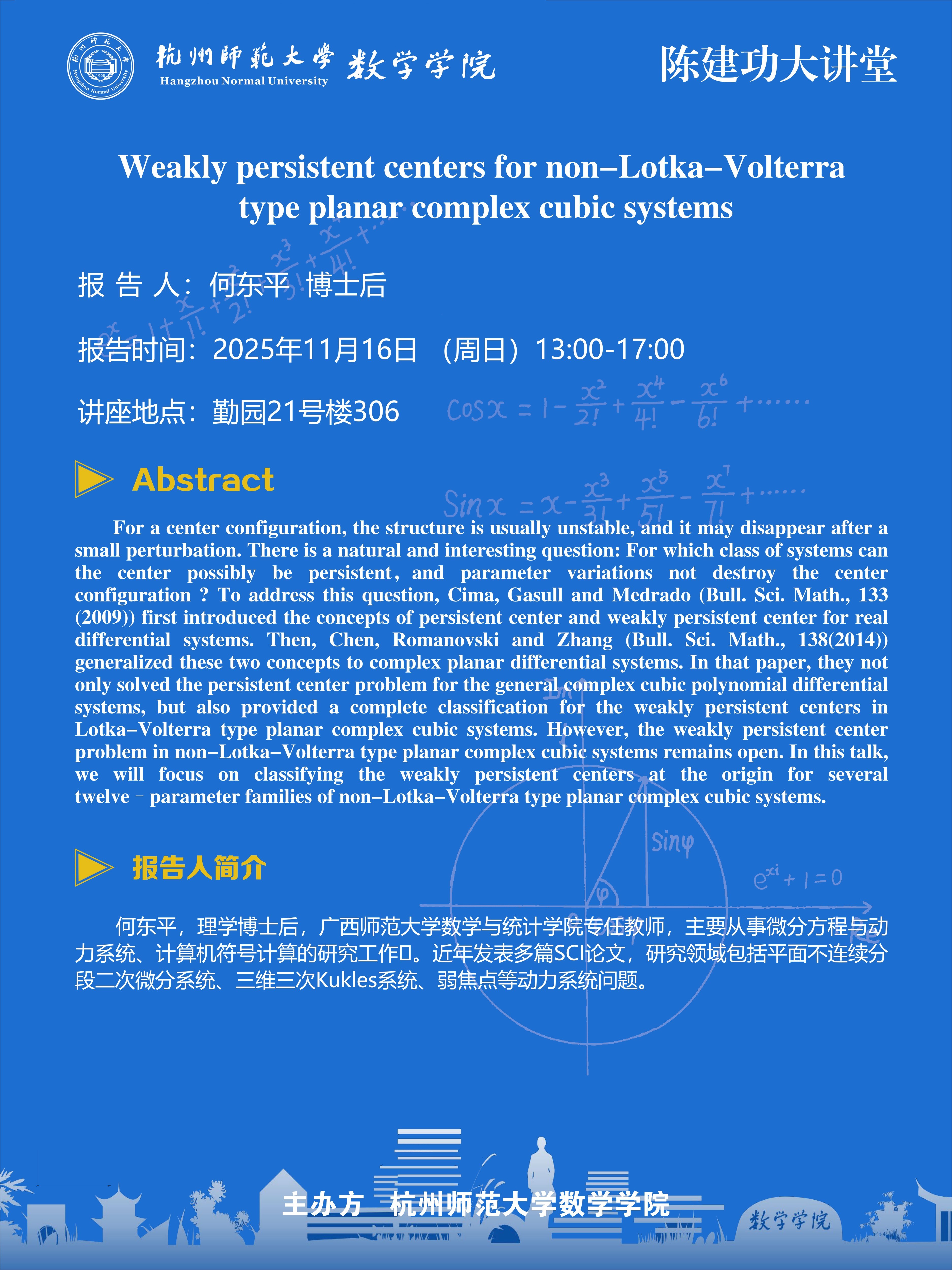 陈建功大讲堂(2025-134):Weakly persistent centers for non-Lotka-Volterra type planar complex cubic systems