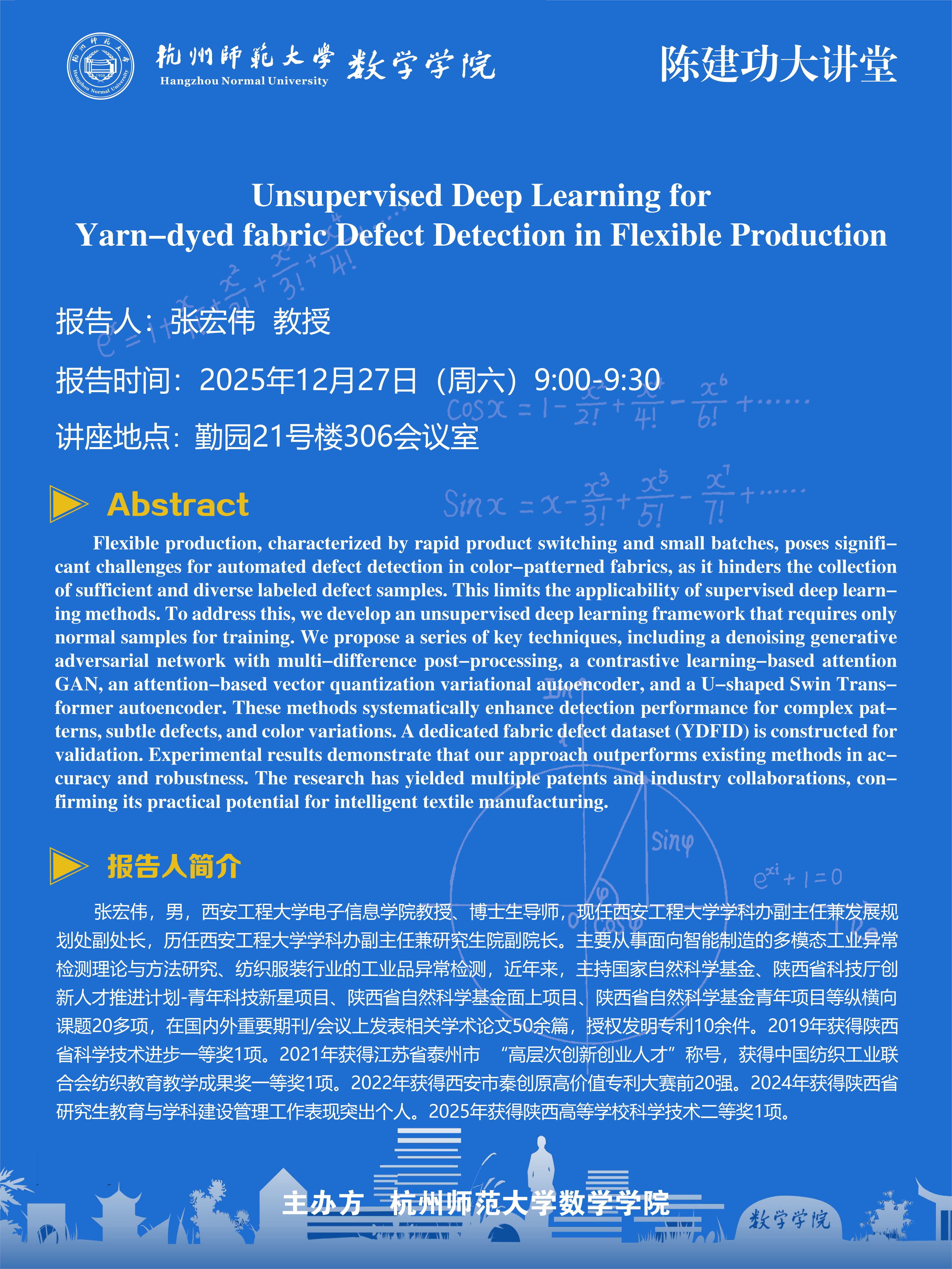 陈建功大讲堂(2025-166):Unsupervised Deep Learning for Yarn-dyed fabric Defect Detection in Flexible Production