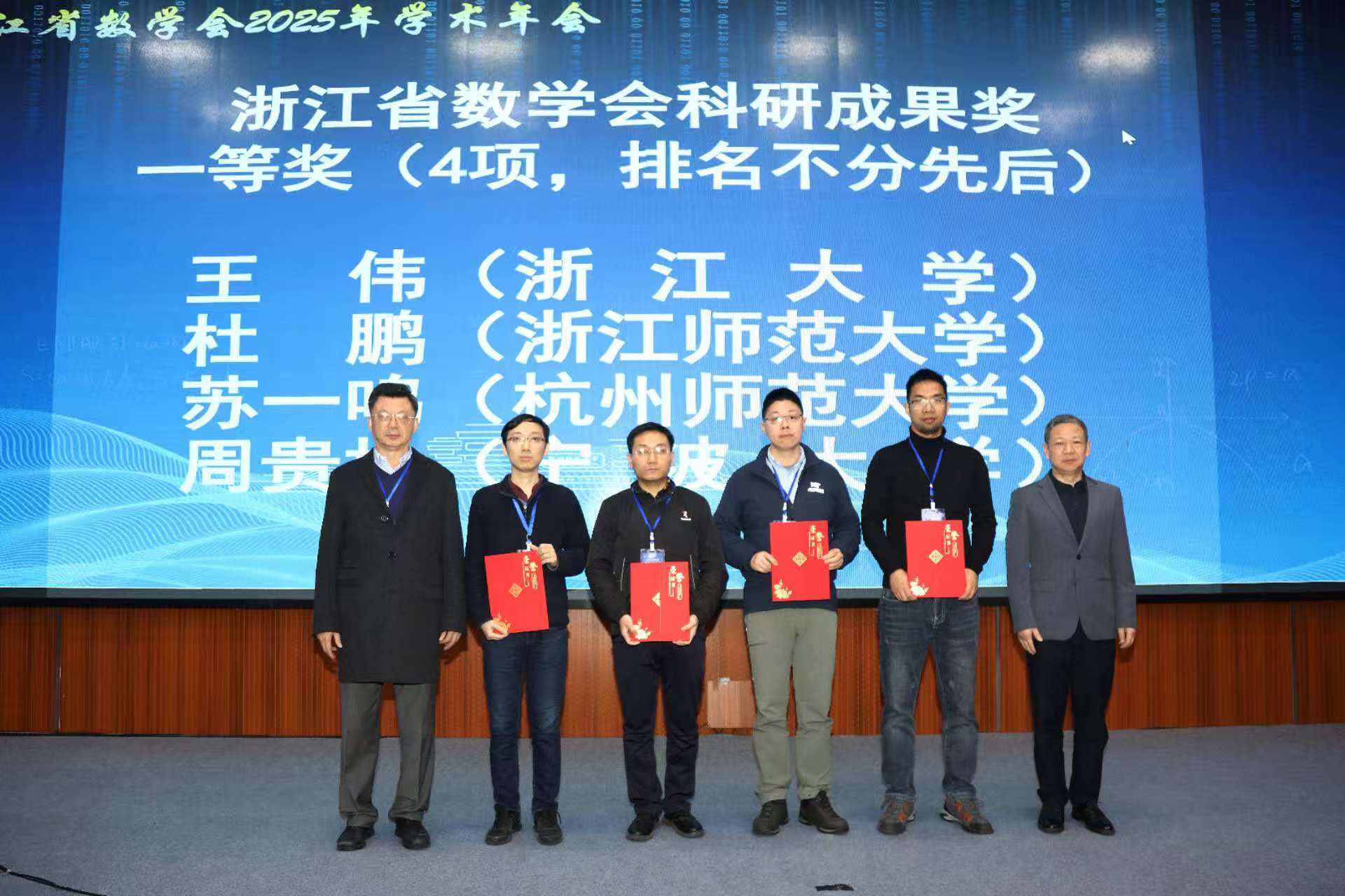 随后,大会举行了浙江省数学会科研成果奖和优秀数学教师奖颁奖仪式。数学会副理事长、浙江大学盛为民教授宣读浙江省数学会优秀数学教师奖名单,数学会副理事长、浙江师范大学院长杨敏波教授为获奖者颁奖。数学会副理事长、宁波大学屈长征教授宣读浙江省数学会科研成果奖名单,数学会副理事长盛为民教授、杭师大黑料吃瓜网 院长谢琪教授为获得浙江省数学会科研成果二等奖的颁奖,数学会理事长包刚院士、杭师大应悦纪委书记为获得浙江省数学会科研成果一等奖的颁奖。我院洪燕勇教授获得优秀教师奖,苏一鸣教授获得科研成果一等奖,尹思露、易彩红获得科研成果二等奖。奖仪式由浙江省数学会秘书长、浙江大学徐翔教授主持。