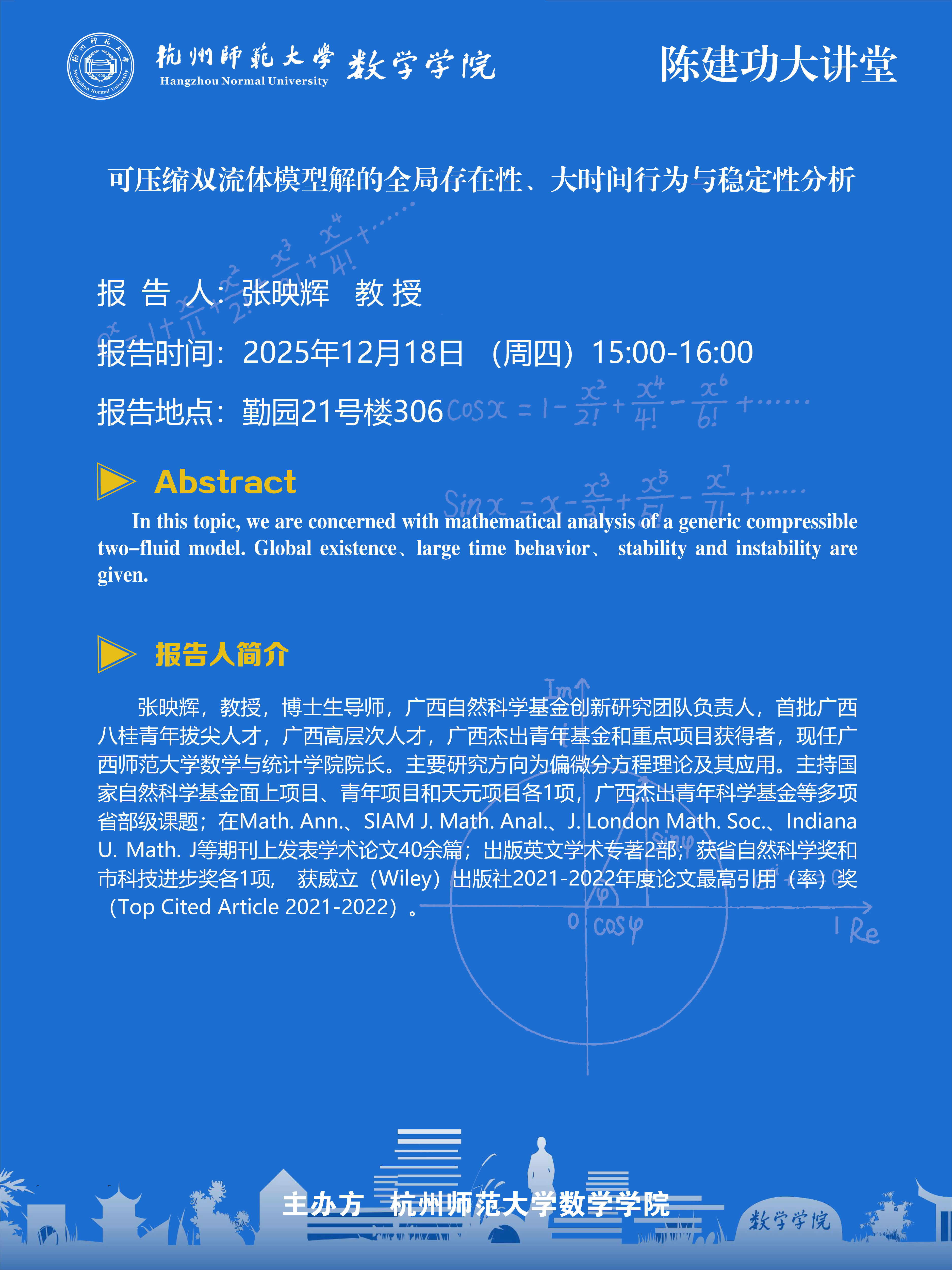 陈建功大讲堂(2025-162):可压缩双流体模型解的全局存在性、大时间行为与稳定性分析